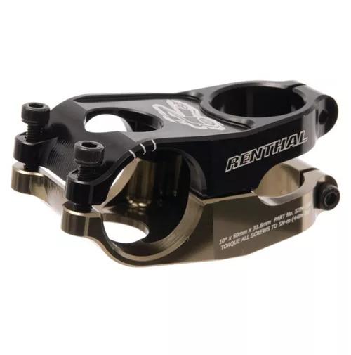 A tough and lightweight mountain bike (MTB) stem that offers much more than just a unique look, the revolutionary two-piece construction of the Strata Duo model delivers outstanding strength without adding excess bulk to your ride. Each piece has been extensively CNC machined by Renthal to shave as much material as possible, without sacrificing rigidity or durability. This special design also gives you a more efficient U-shaped handlebar clamp area, which removes the usual stress points that can cause your bars to become damaged or even fail. It’s an ideal choice for aggressive riders who want to make their bike’s front end lighter and to have a distinctive look.